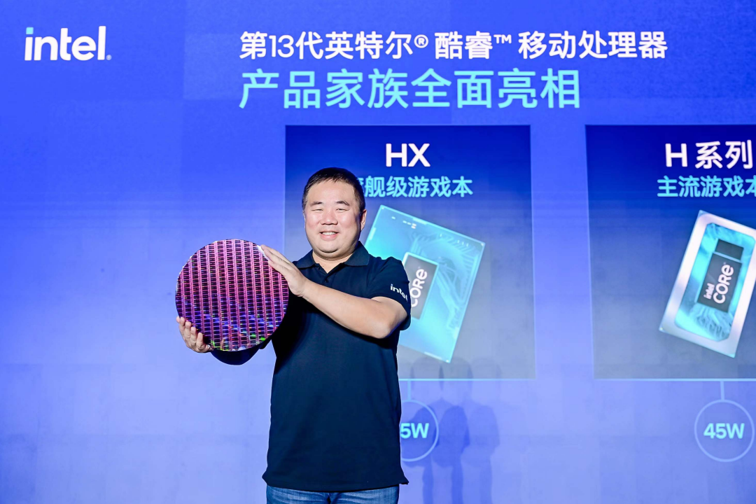 英特爾在大會現(xiàn)場(chǎng)展示第13代酷睿處理(lǐ)器(qì)晶圓,圖中為(wèi)英特爾中國區技術部負責人(rén)高宇
